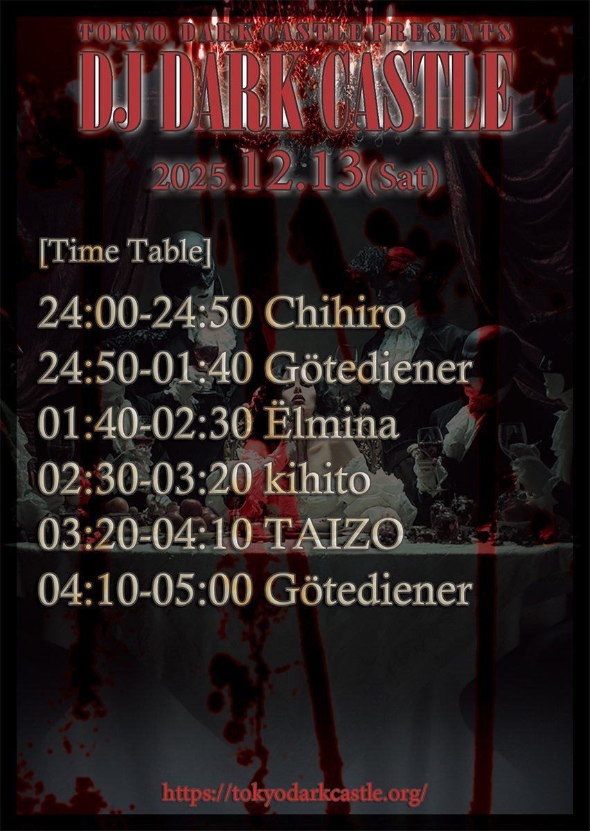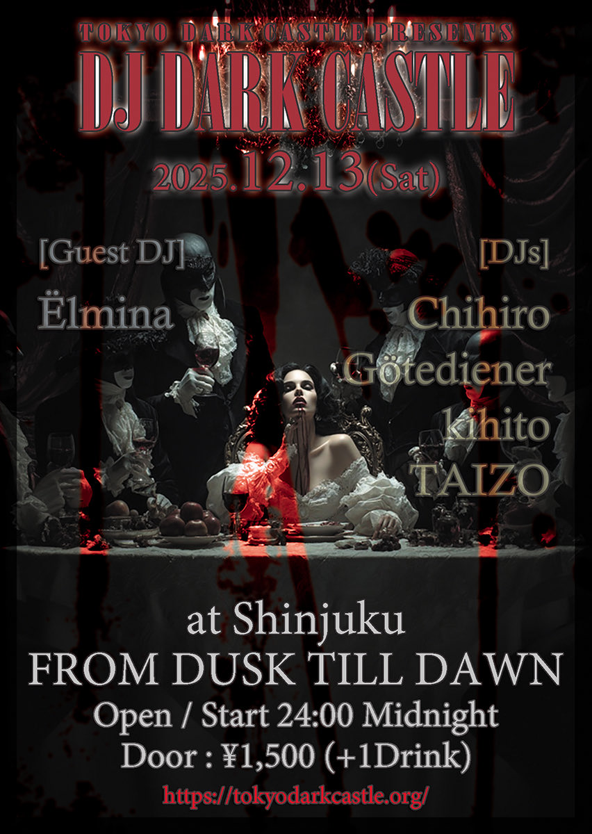 2025.12.13(sat) at Shinjuku From Dusk Till DawnOpen / Start 24:00Door ¥1,500(+D)Guest DJ : ËlminaDJ : Chihiro / Götediener / kihito / TAIZO