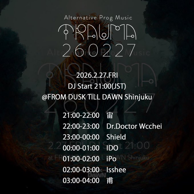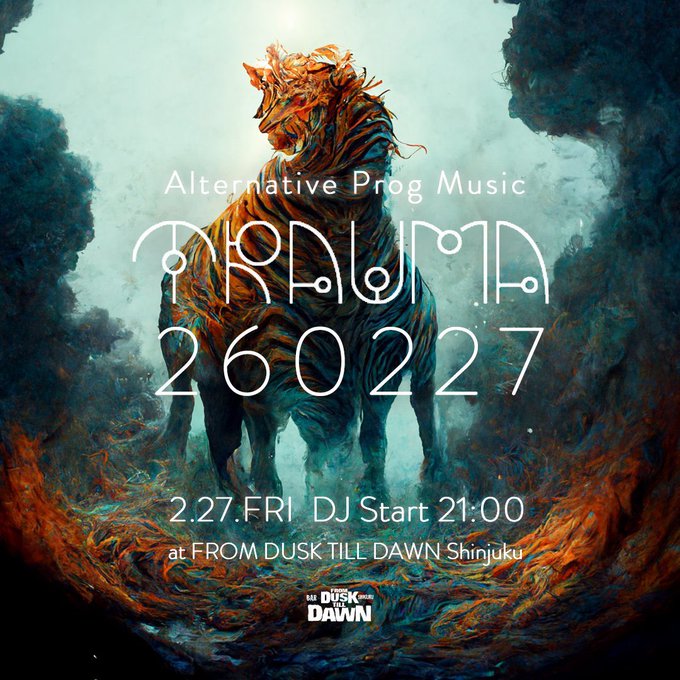 【TRAUMA260227】2026.2.27(金)Alternative【慣習(伝統)的方法をとらない】且つ、Prog【進歩的な, 革新的な】な音楽の共有を目的としたDJ型イベント。当イベントにおいて発生した音楽的なTRAUMA【精神的外傷】についての責任は負いかねますことをあらかじめご了承ください。