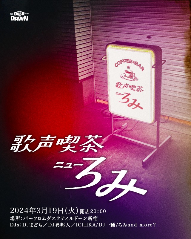 2024.3.19(火)歌声喫茶 ニューろみ昭和歌謡曲ナイト♪半年ぶりの人気イベント!やります!普段と違うダスクをお楽しみください!!祝前日の夜を歌声と美酒で酔いしれよう♪DJまどち、DJ異邦人、ICHIKA、DJ 一稀、ろみ