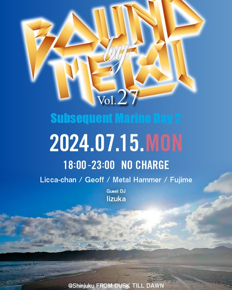 BOUND BY METAL Vol.27Subsequent Marine Day 22024.7.15 [Mon]18:00 - 23:00No ChargeDJLicca-chanGeoffMetal HammerFujimeGuest DJIizuka